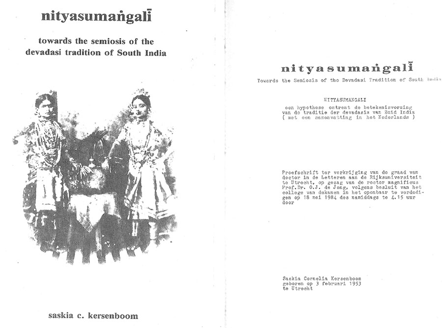 The commercial edition (1987) is based on the integral script of the PhD version Nityasumangali, towards the semiosis of the devadasi tradition in South India, defended on 18 May 1984 with honours (cum laude) by Saskia Kersenboom, at Utrecht University, The Netherlands. This PhD version can be accessed at: www.academia.edu/25304347